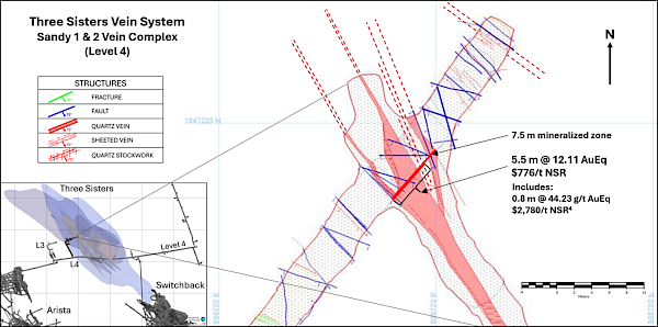 In December 2024, DDGM commenced drift development to access the Three Sisters vein system. The development on Level 4 has successfully intersected the Sandy 1 and Sandy 2 veins, revealing widths of up to 7.5 meters within a complex of colloform banded, hydrothermal breccia quartz veins. Detailed production channel sampling of these veins has confirmed high-grade results, with individual samples returning up to 44.23 AuEq and $2,780/t NSR4.