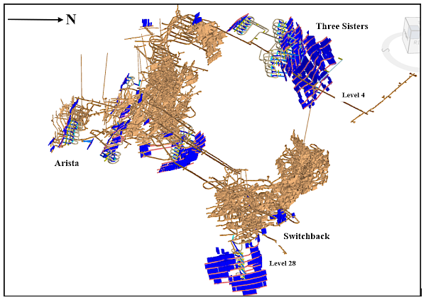 View of the Arista, Switchback and Three Sisters LOM stopes (blue) – looking northwest.