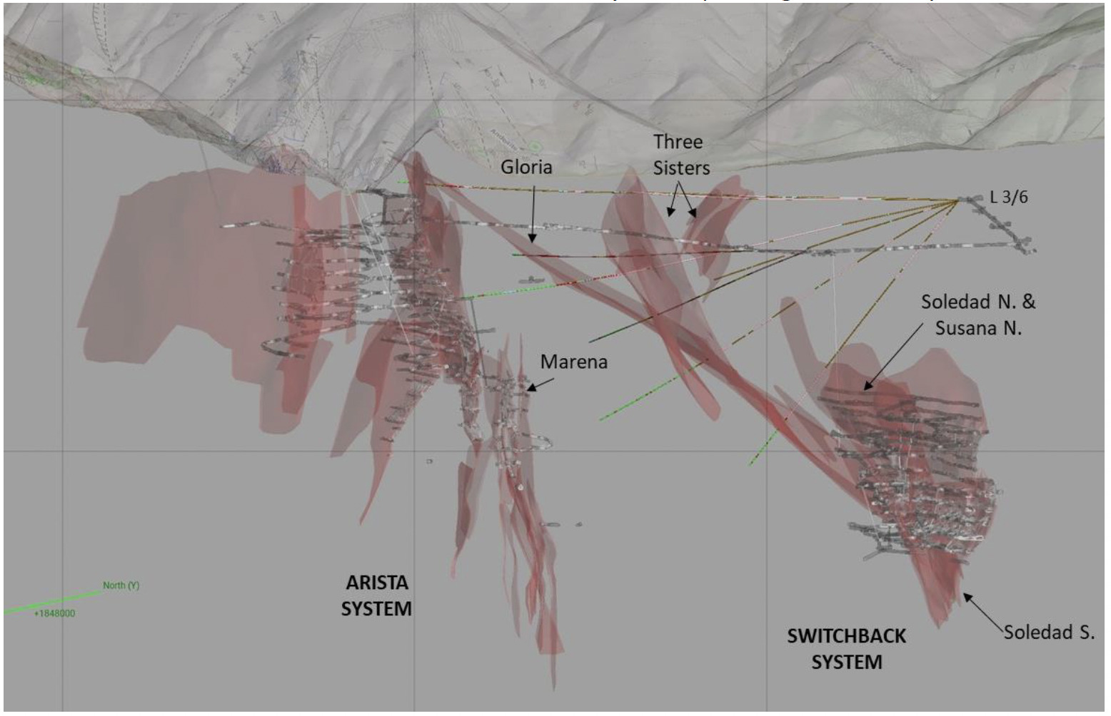 After detailed reinterpretation of 2022 drill data, a new vein system was discovered via the continuation of drill holes to the west beyond the Three Sisters vein system to where a new, previously unrecognized vein system, with significant base metal mineralization was intersected. This new system (Gloria) is located west of Three Sisters and north and east of the Arista vein system. Located along a structural weakness at the lithological contact between Tertiary volcanics and Cretaceous basement sediments, initial drill results show good potential to add new additional base metal resources from this zone. The interplay of the Gloria vein system with the Three Sisters vein system is now a primary focus of the 2023 expansion drilling program with two diamond drill rigs on Level 3 continuing to focus on step-out and infill holes on both vein systems.