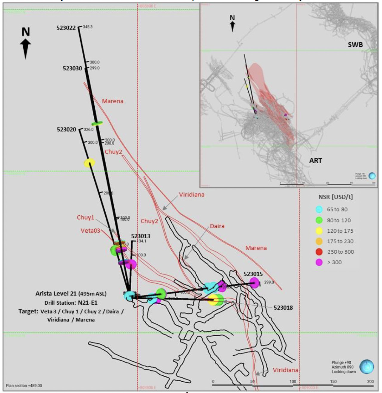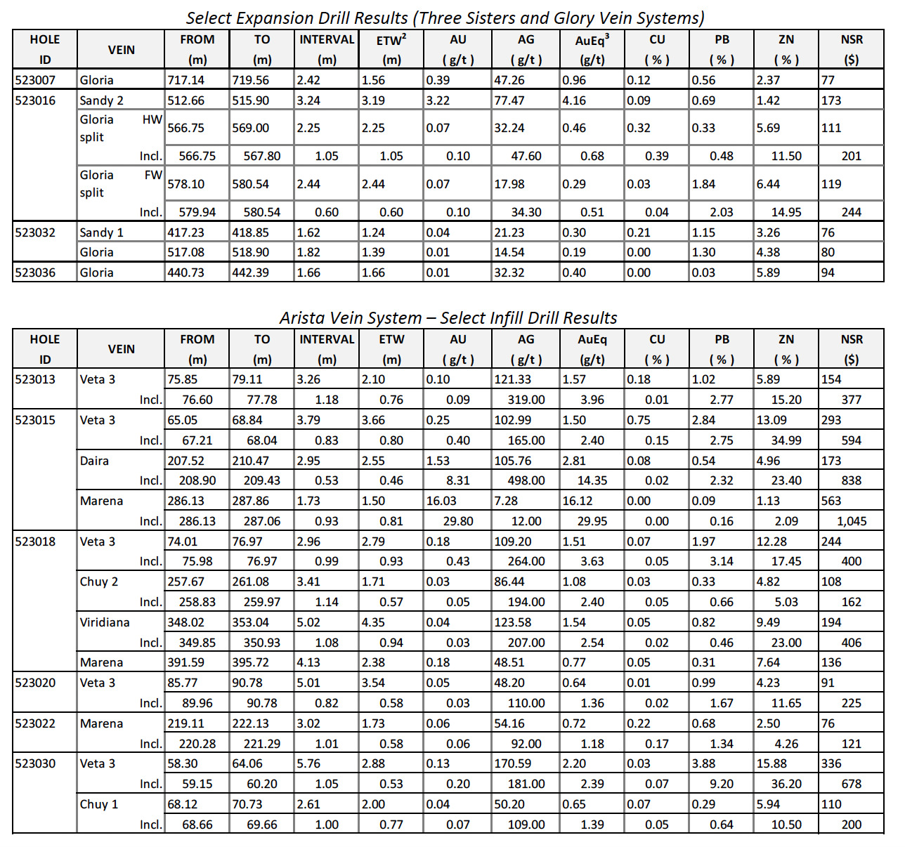 Infill and step-out drilling from Level 21 drill stations in the Arista vein system successfully intercepted a series of closely spaced veins down-dip below and along strike to the north-west of the existing Arista mine workings. Infill drilling results during this period along the north-west extension of the Arista vein system continues to show structural continuity (along strike and at depth) and economic potential within these veins beyond areas previously modelled and outside the current resource shell. Of important note, 1) the presence of accessible high-grade gold mineralization immediately below the current productive Level 21 of the Arista mine, and 2) evidence of the robust vertical nature of the Arista epithermal vein system with the continuation of high-grade precious metals at depth. Select highlights from year-to-date 2023 holes in the north-west Arista vein system include: