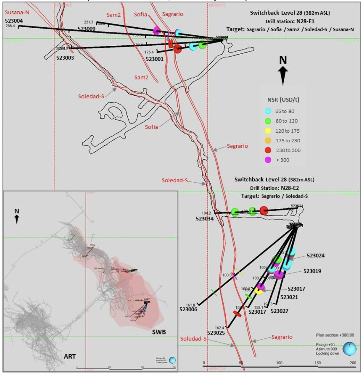 Infill and step-out drilling from Level 28 in the Switchback vein system continues to successfully confirm the continuity and strength of the South Soledad and Sagrario veins along strike to the south-east and down-dip from the current Switchback deposit resource shell. Recent drilling continues to give strong indications there is potential to discover and expand additional polymetallic mineralization plunging steeply in a south-easterly direction on these veins. The Sagrario and Soledad vein systems continue to show structural integrity at depth along with the continued presence of high-grade precious metals. Drilling during 2023 has also shown the continuity of mineralization in other sub-parallel veins of the central Switchback system. Select highlights from year-to-date 2023 holes from the Switchback vein system are as follows: