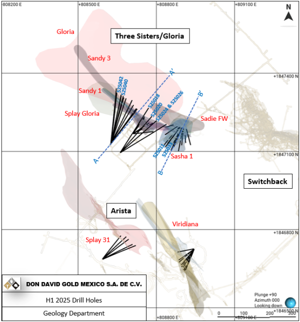 2025 Drill Results and Program: Through the first half of 2025, a total of 51 underground definition and ore-control drill holes, totaling 6,615 meters of diamond drilling, have been completed at DDGM. The program continues to deliver high-grade intercepts that confirm the continuity and quality of the mineralization. These results have further defined the geologic model for the Three Sisters and Gloria vein systems, while also upgrading mineral resources within select veins of the Arista system. The Company plans to initiate additional exploration development in the second half of 2025 to support further infill and expansion drilling, particularly to the northwest of the currently defined extents of the Three Sisters – Gloria zone.