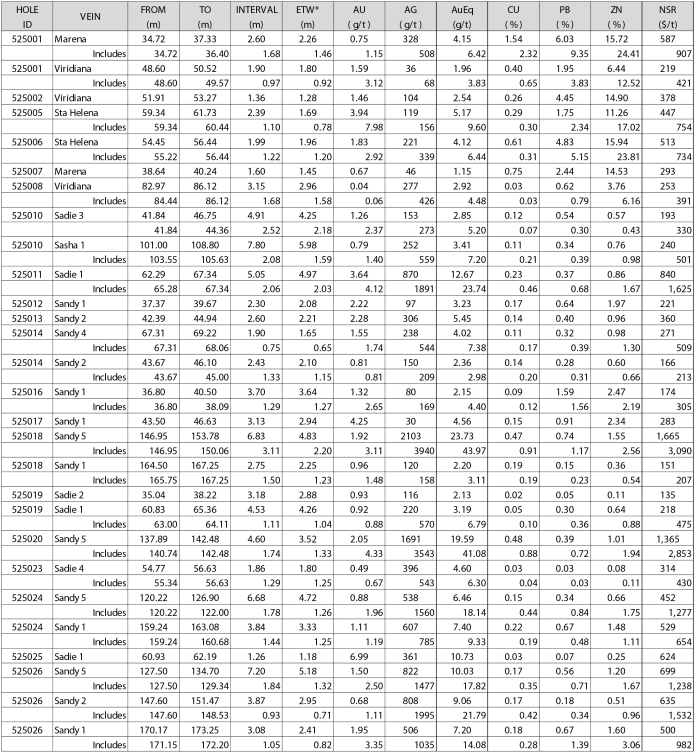 - Drill results from the new Three Sisters Vein System continue to return consistent results that indicate good width and grades that indicate potentially higher Net Smelter Return1 values (“NSR”).