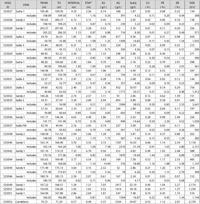 - Includes: $2,641/t NSR over 0.51 meters (38.03 g/t AuEq)