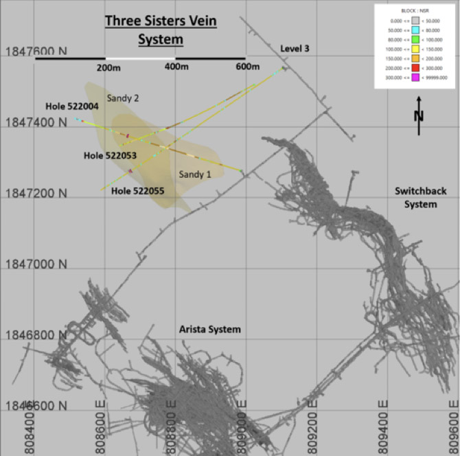 The Three Sisters vein system is located between the Arista and Switchback vein systems. Drilling is currently underway, in the upper parts of Three Sisters, from recently built drill stations on Level 3 in the north-west Switchback system. The Three Sisters vein system continues to remain open to the north-west up-dip as well as at depth. Most notably, intercepts in Hole No. 522055 are significantly outside the current resource shell and were key in confirming the direction of the 2023 drill program. The 2023 drilling program will progress from Level 3 while 200 meters of additional drift development continues to the north-west where phase 2 drilling will take place in the second half of the year. Highlights from holes drilled in 2022 at Three Sisters are as follow: