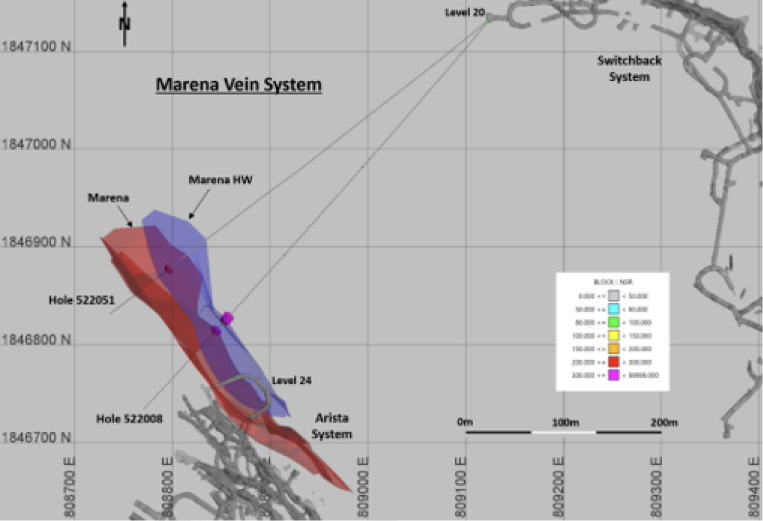 Exploration drilling during the fourth quarter of 2022, from drill stations at Level 20 located in the footwall of the Switchback vein system, successfully intercepted the Marena vein system along strike to the north-west, approximately 100 meters below the existing Arista mine workings. Infill drilling in the growing Marena vein system continues to show strength, structure and economic potential depth beyond areas previously modelled and outside the current resource shell. During 2023, exploration drilling will continue testing the down-dip and north-western extensions of mineralization of the Marena system (Arista mine) in conjunction with the necessary exploration development. Highlights from Marena drill results include: