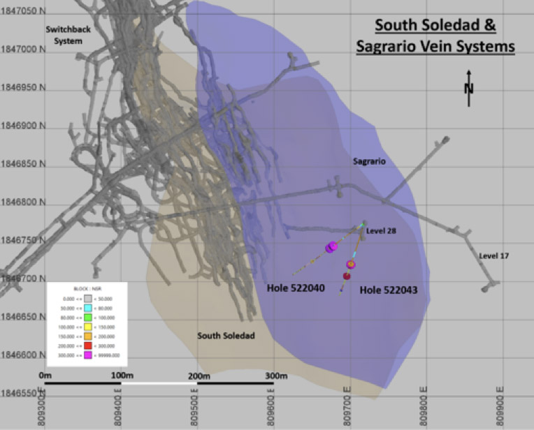 Infill drilling during the fourth quarter of 2022 successfully confirmed the continuity and strength of the South Soledad and Sagrario vein systems along strike to the south-east and down-dip from the current Switchback deposit resource shell, giving strong indications there is potential to discover and expand additional polymetallic mineralization plunging steeply in a south-easterly direction. Infill drilling is currently ongoing in this zone which is pending incorporation into the 2023 resource estimate. During the second quarter of 2023, exploration drill plans include step-out holes at 100-meter increments along the South Soledad and Sagrario veins with expectations to add resources. Highlights of fourth quarter 2022 infill drill results for the South Soledad and Sagrario veins are as follows: