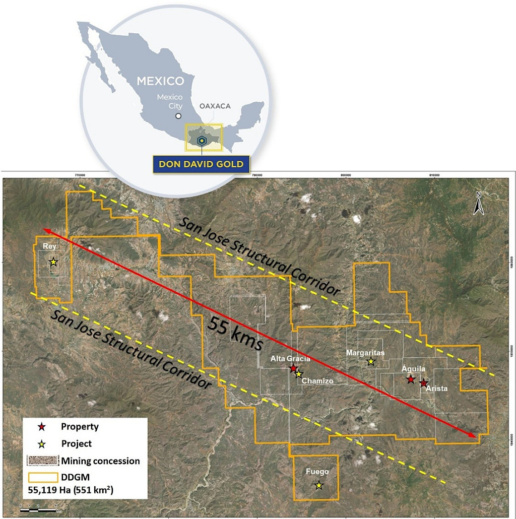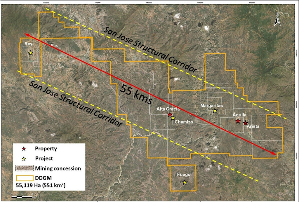 DDGM’s district-scale work has also advanced earlier-stage targets beyond the active mine areas. At the El Rey property (approximately 55 km northwest of Arista), drilling has returned high-grade gold results, including 132.5 g/t Au over 1.0 m. The Company also reported initial drill results at the centrally located Las Margaritas project area in 2013, including 2.85 m of 27.90 g/t Au and 2,600 g/t Ag. Regional surface sampling, geologic mapping, and airborne geophysics have generated multiple additional targets between El Aguila and El Rey that warrant follow-up exploration.